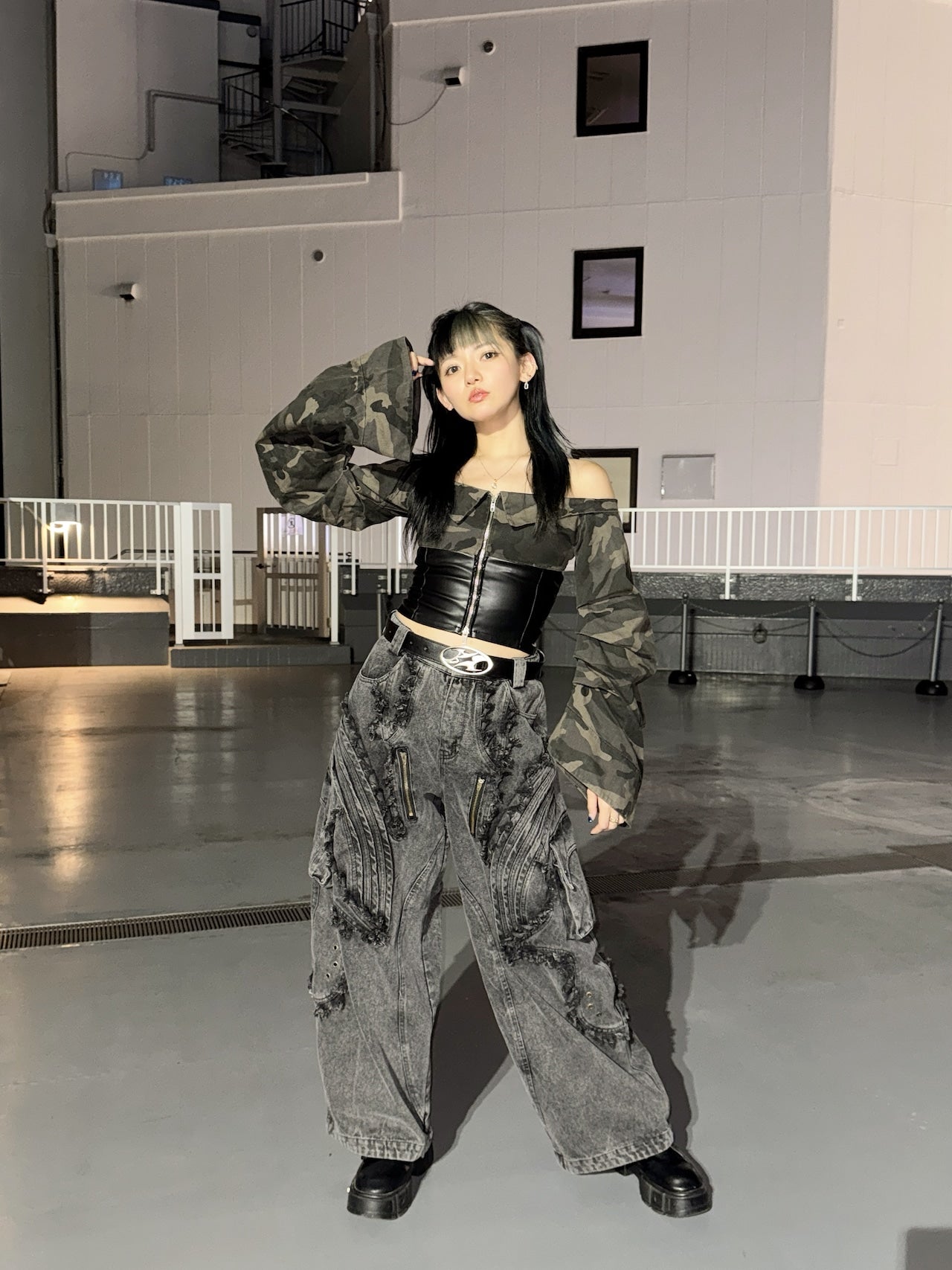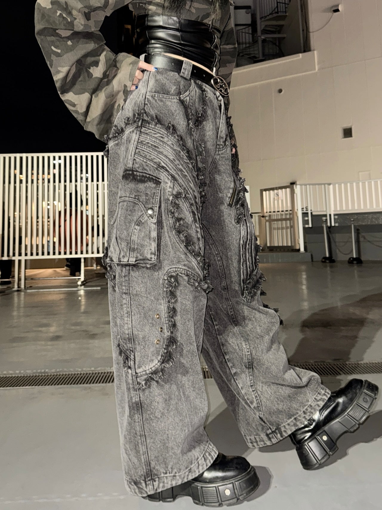 ウォッシュの効いたグレーのボディに大胆な切り替えを重ね、モードかつストリートな印象を演出。サイドのカーゴポケットやハードなフリンジ加工がアクセントとなり、他にはないデザイン性を際立たせます。