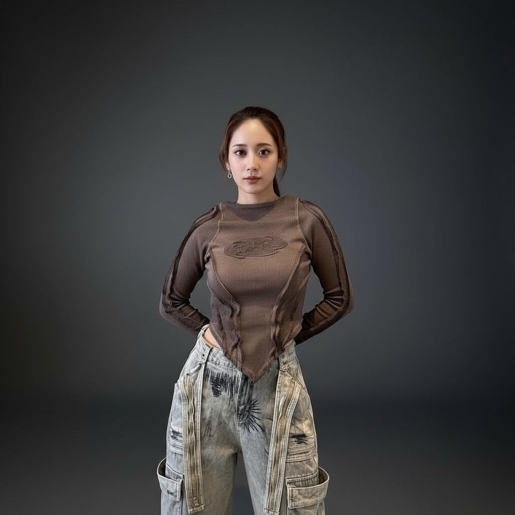 全体に走る立体的なシーム切替と、あえてラフに残したダメージ加工が身体のラインをシャープに演出します。