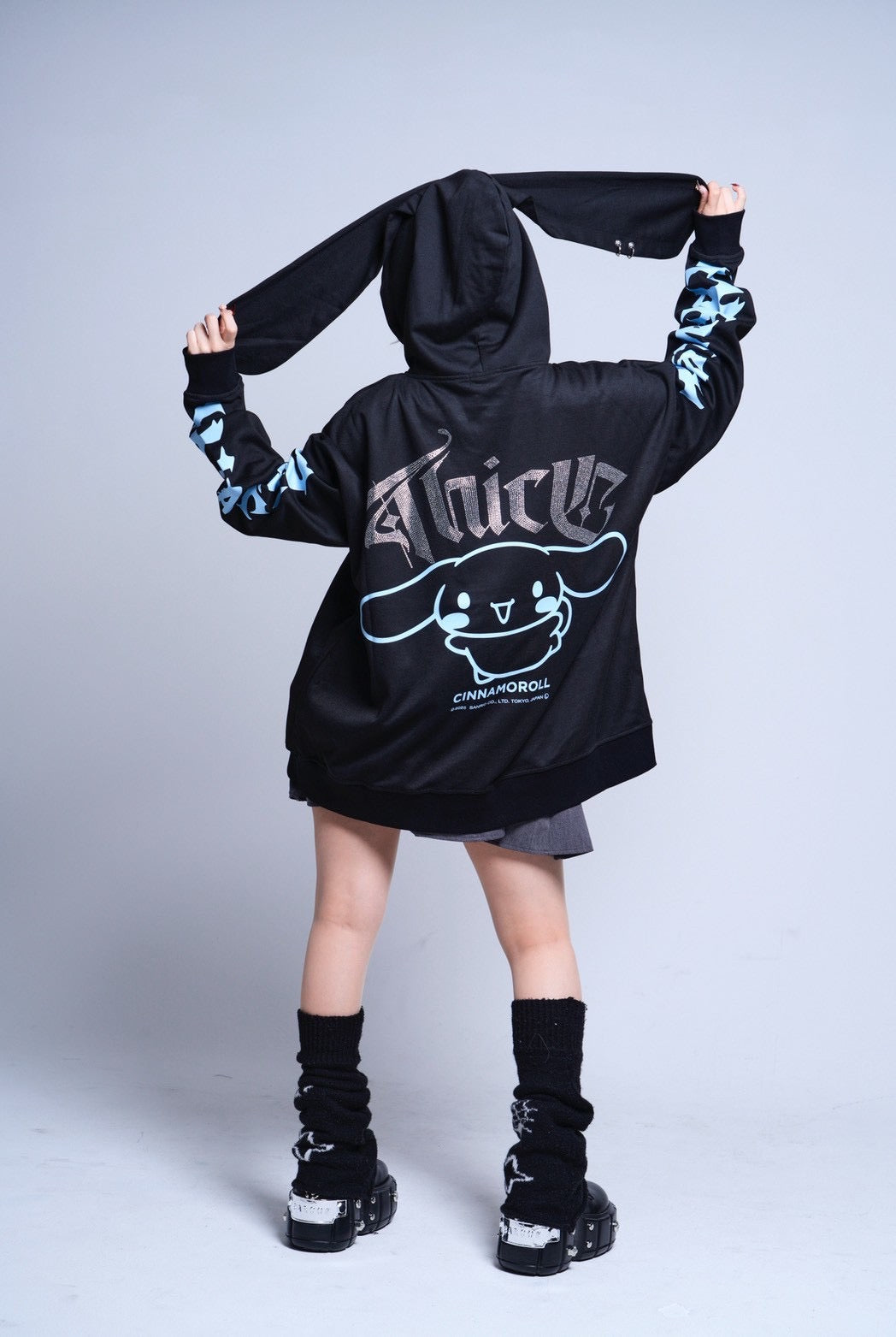 背面に大きくシナモロールのイラストがプリントされており、その上にはスタイリッシュなゴシック調のが配置されています。フード