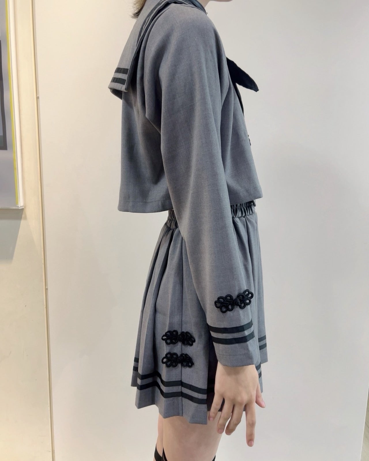 襟元や袖の飾りタッセル、スカート裾のラインデザインがアクセントになり、全身のシルエットをバランス良く引き締めてくれます。